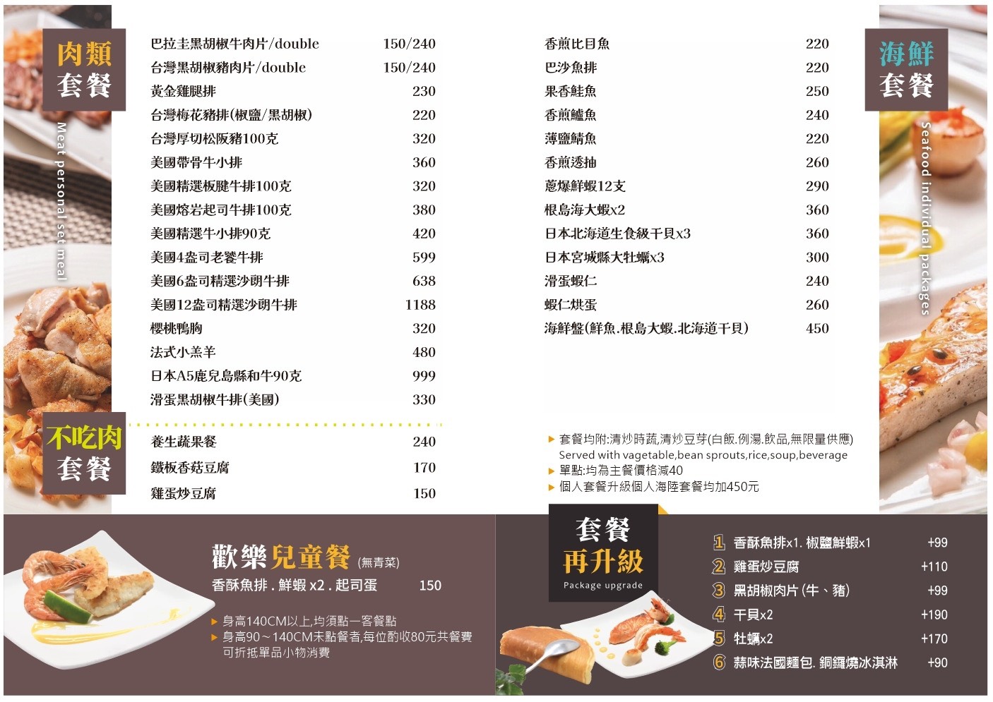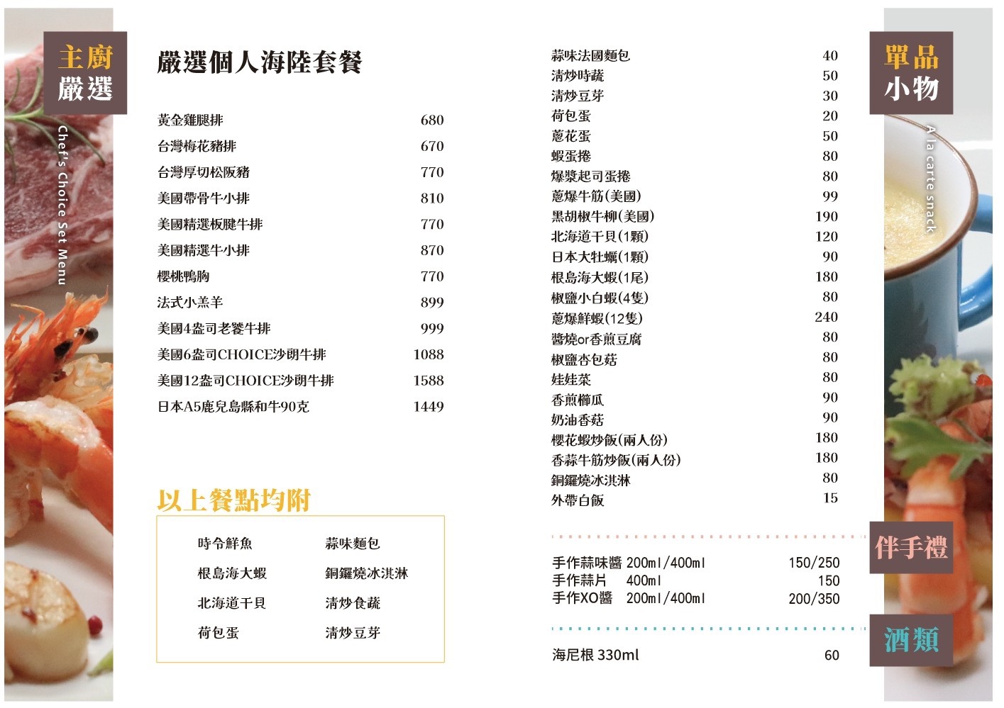 我們的餐點,出自於廚師們的創意及用心, 顛覆一般傳統台式的鐵板燒,開創出西式精緻的鐵板料理,每道料理的呈現, 都是師傅們精心的組合料理,希望帶給大家滿足而濃濃的笑意。